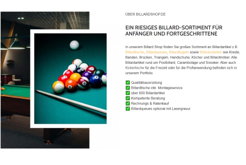 Billardshop.de hat sich auf alles rund um das Thema Billard spezialisiert. Bei billardshop.de finden Sie eine riesige Auswahl an Poolbillard-, Carambolage- und Snookerartikeln.