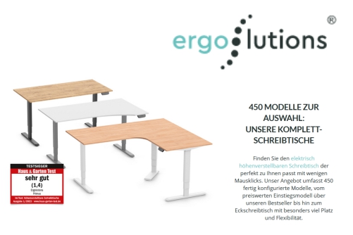Ergolutions ist ein innovatives Unternehmen, das hochwertige Lösungen für ergonomische Arbeitsplätze bezahlbar macht. Im direkten Vertrieb an private, gewerbliche und öffentlich-rechtliche Kunden bietet Ergolutions hochwertige Qualität zu günstigen Preisen. Das Produktangebot umfasst elektrisch höhenverstellbare Schreibtische, ergonomische Bürostühle und Zubehör für einen gesunden Alltag im Büro.