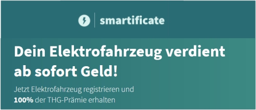 Als Fahrer eines E-Autos hilft man aktiv dabei, klimaschädliche Treibhausgasemissionen zu reduzieren. Dieses Engagement erkennt der Gesetzgeber ab 2022 an. Im Rahmen des Förderinstruments Treibhausgasminderungsquote (kurz THG-Quote), kann man sich die CO₂-Einsparungen zertifizieren lassen und an quotenpflichtige Unternehmen verkaufen. Somit hat man die Möglichkeit, mit Smartificate Geld von Ölkonzernen in die Elektromobilität umzuverteilen. Smartificate übernimmt dabei die komplette Abwicklung für den User - dieser braucht sich lediglich auf die Auszahlung zu freuen. Einfach Elektrofahrzeug bei smartificate registrieren und bis zu 250 Euro ausgeschüttet bekommen. Und das Beste: Smartificate zahlt die Prämie jedes Jahr aufs Neue!